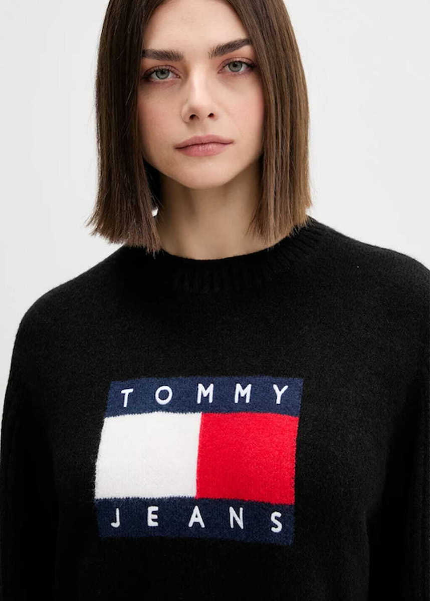 Αυτό το άνετο Γυναικείο Πλεκτό Φόρεμα Μαύρο Tommy Jeans DW0DW21462-HEV ολοκληρώνεται με ένα εντυπωσιακό intarsia σήμα Tommy στο μπροστινό μέρος.