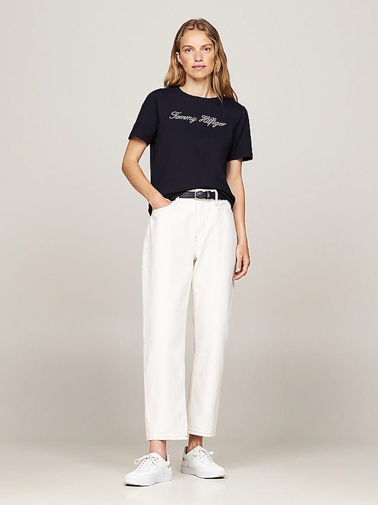 Αυτό το ευκολοφόρετο Γυναικείο Script T-shirt Navy Μπλε Tommy Hilfiger WW0WW43459-02G είναι φτιαγμένο από οργανικό βαμβάκι με branded λεπτομέρειες και iconic λογότυπο.
