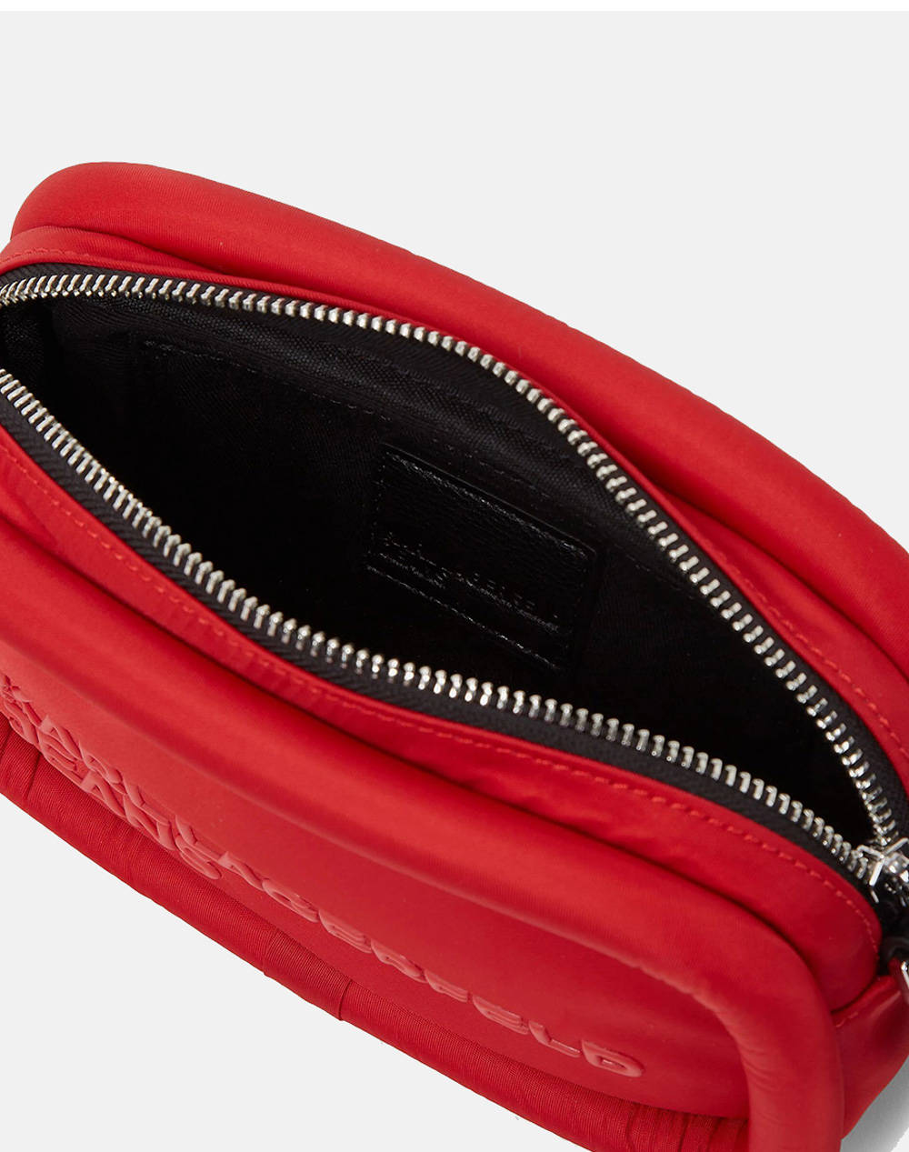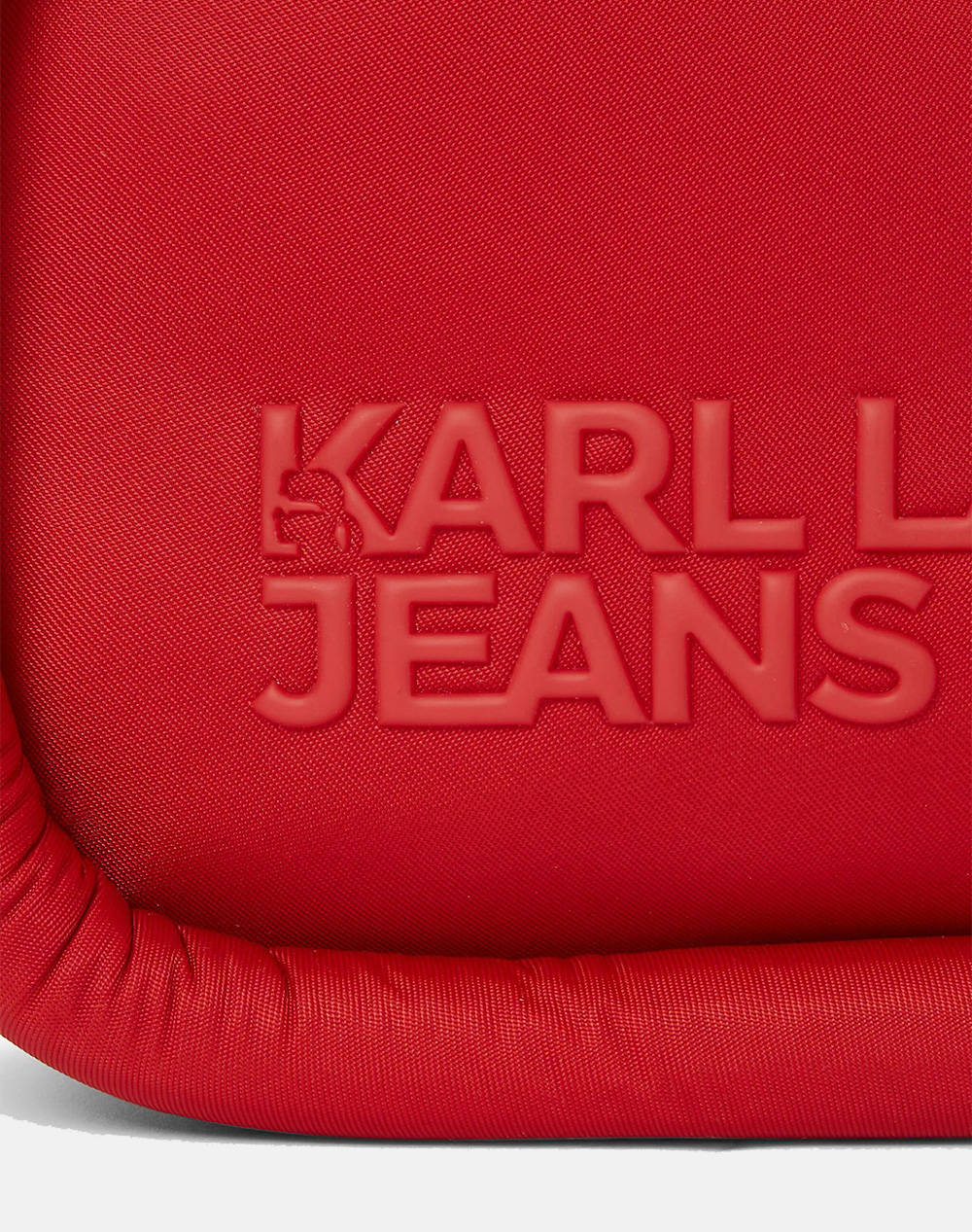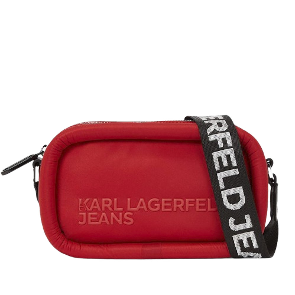Ο πρακτικός σχεδιασμός από αυτή τη Γυναικεία Puffy Τσάντα Χιαστί Κόκκινη Karl Lagerfeld Jeans 246J3016-J390 RED αναβαθμίζεται χάρη στo ανάγλυφο λογότυπο μπροστά.